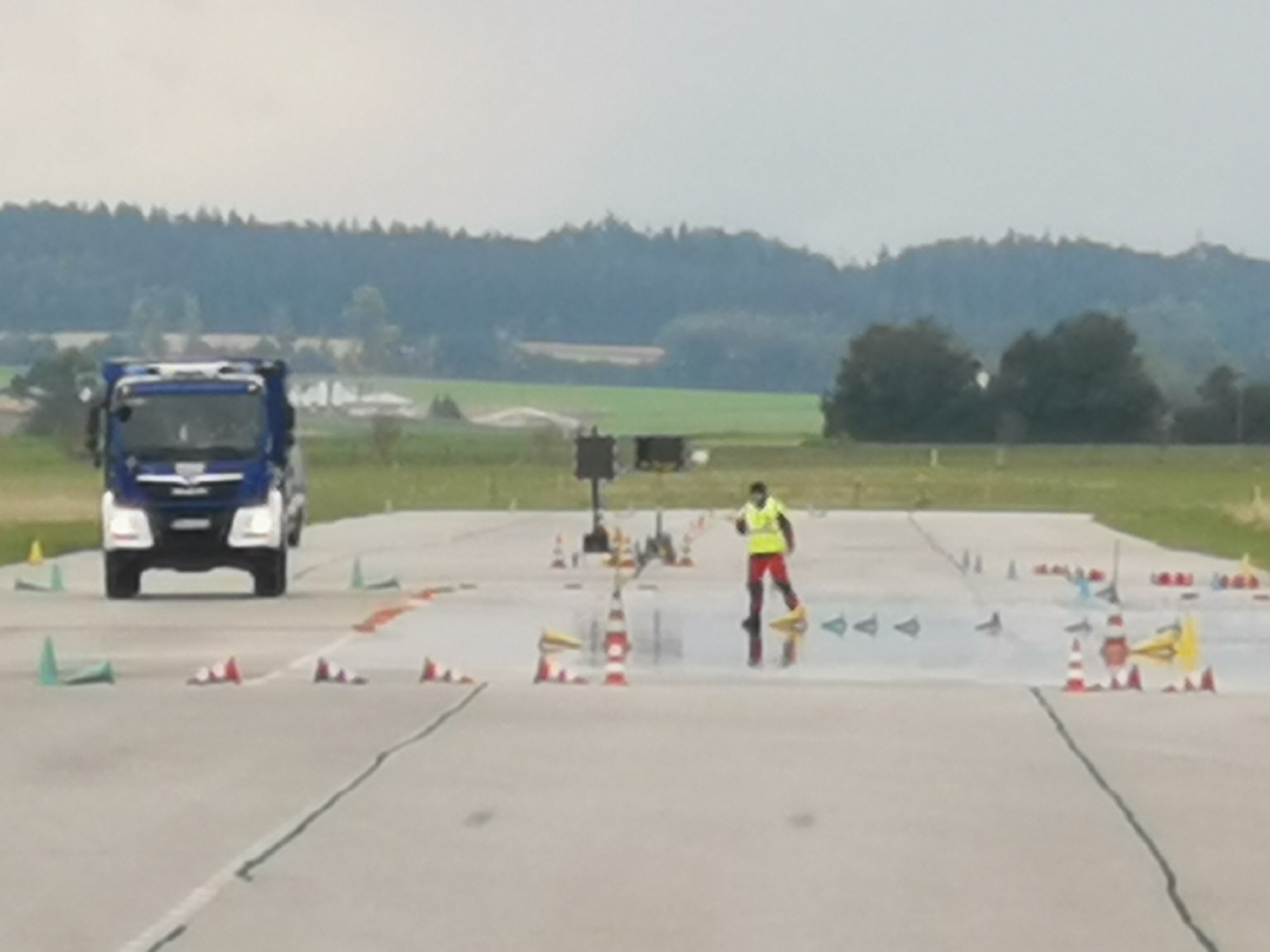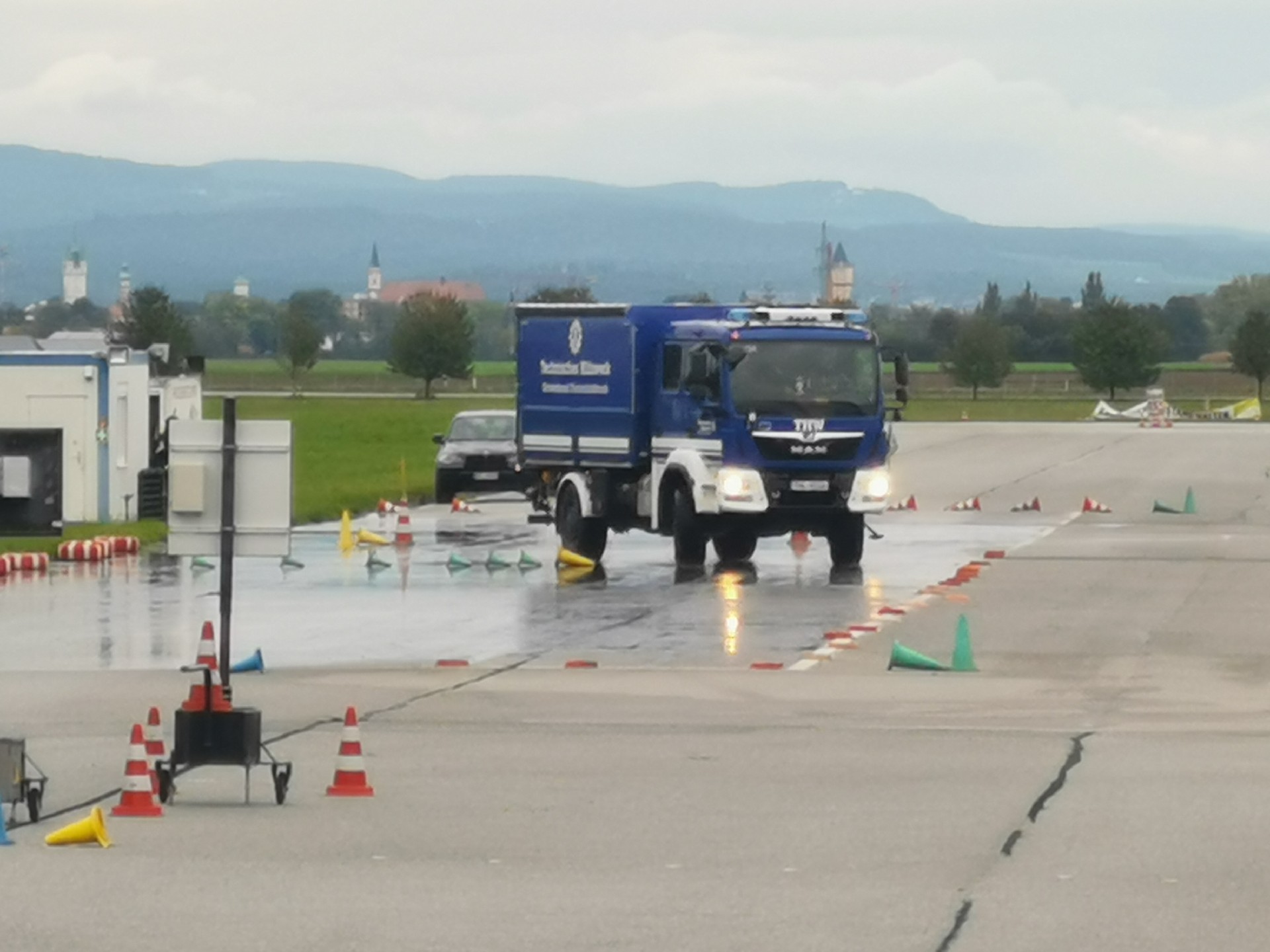 Das Fahrsicherheitstraining wurde vom Kraftfahrausbildungszentrum Feldkirchen organisiert und fand in der Gäubodenkaserne, Nähe Straubing in Niederbayern, statt. Das Ziel des Trainings war das verkehrs- und betriebssichere Führen eines THW-Einsatzfahrzeuges unter widrigen Straßenverhältnissen. Bevor die Praxismodule dazu durchgeführt wurden, gab es im Unterrichtsraum einen Theorieteil zu vorgeschriebenen Reifeneigenschaften und der Einrichtung des Fahrerarbeitsplatzes. Auf der großzügigen Fahrtrainingsfläche folgten dann die Module Slalom, Kurvenfahrt, Gefahrenbremsung, Ausweichmanöver und Zielbremsung. Die Bremsübungen wurden einerseits auf griffigem Asphalt sowie andererseits auf einer Gleitfläche durchgeführt, welche schneebedeckte Straßenverhältnisse simuliert. Die Ausweichmanöver wurden auf der Gleitfläche absolviert und zeigten den Teilnehmern den Umgang mit ABS, was dem Fahrer ermöglicht dem Hindernis noch auszuweichen. Die vollends gelungene Veranstaltung wird den Teilnehmer helfen, die großen und kleinen Einsatzfahrzeuge des THW, vor allem auf Einsatzfahrten, sicher zu führen. (SW)