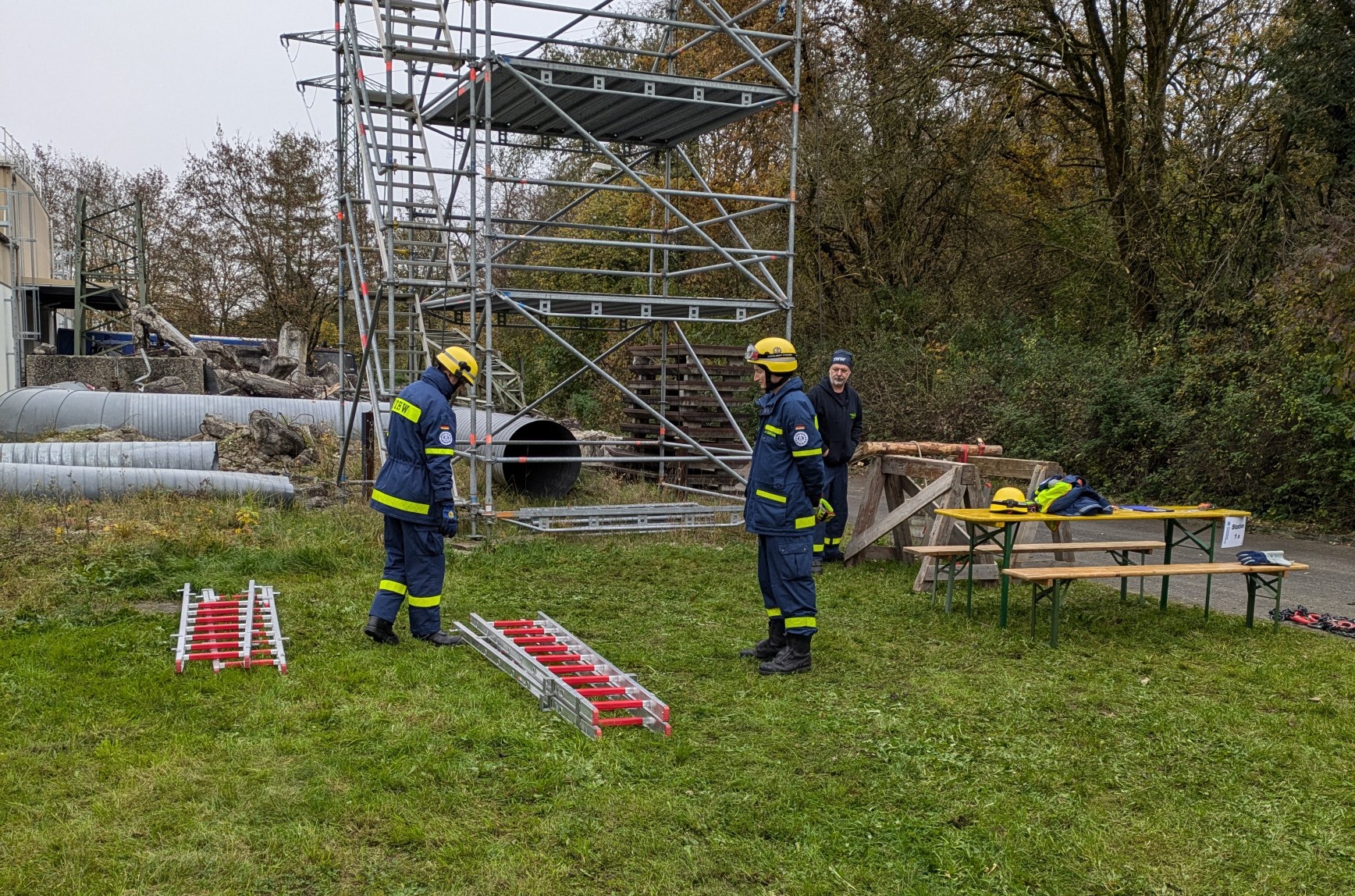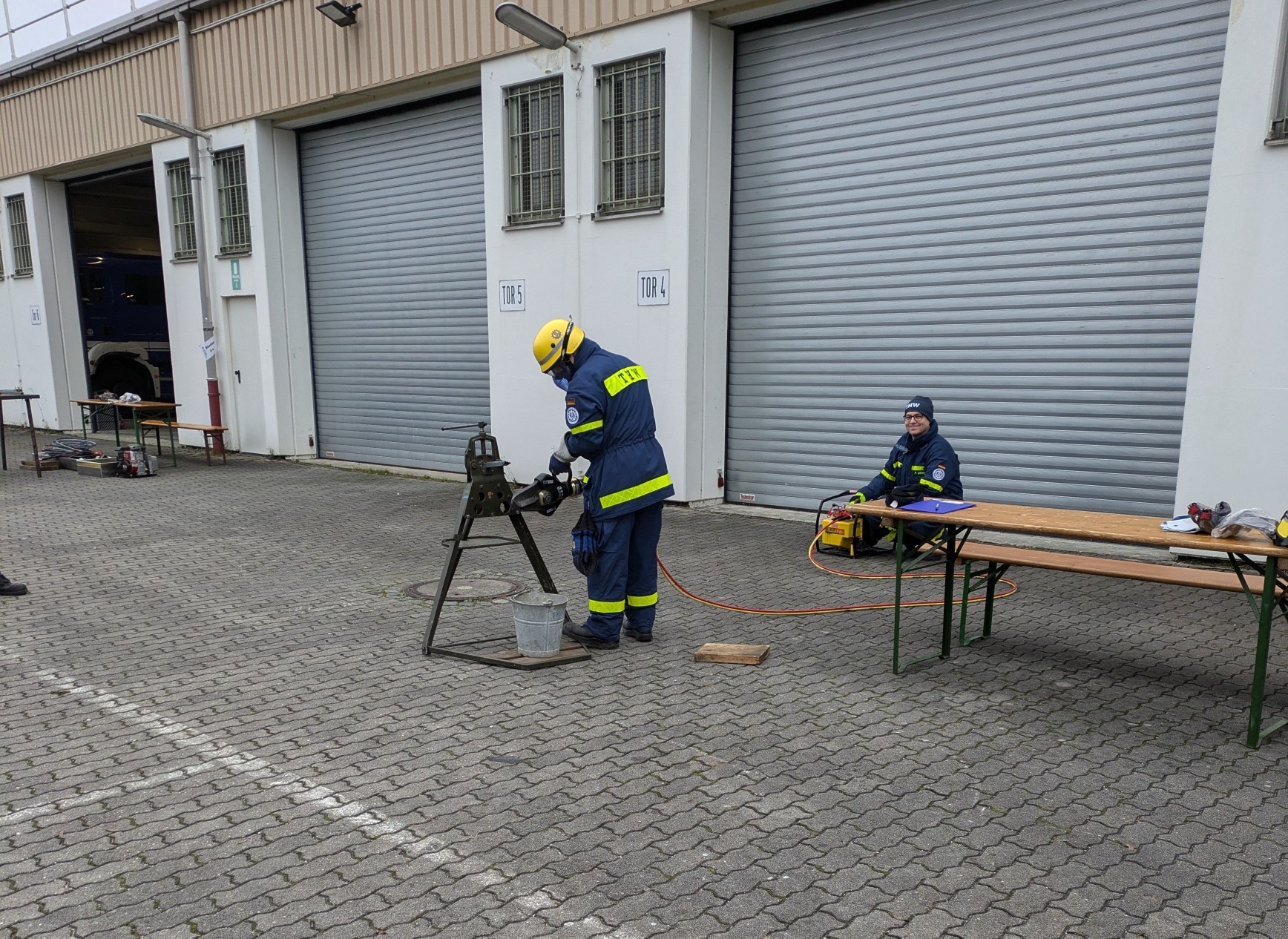 Die Prüfung umfasste eine Reihe von Aufgaben, bei denen das theoretische Wissen und die praktischen Fähigkeiten der Anwärter gefragt waren. Es musste der sichere Umgang mit verschiedenen Werkzeugen, das Bedienen des tragbaren Stromerzeugers, der Einsatz des hydraulischen Rettungssatzes, sowie das Arbeiten mit Pumpen und Leitern unter Beweis gestellt werden. Auch das Anfertigen von Stichen und Bunden war ein Teil der praktischen Prüfung.