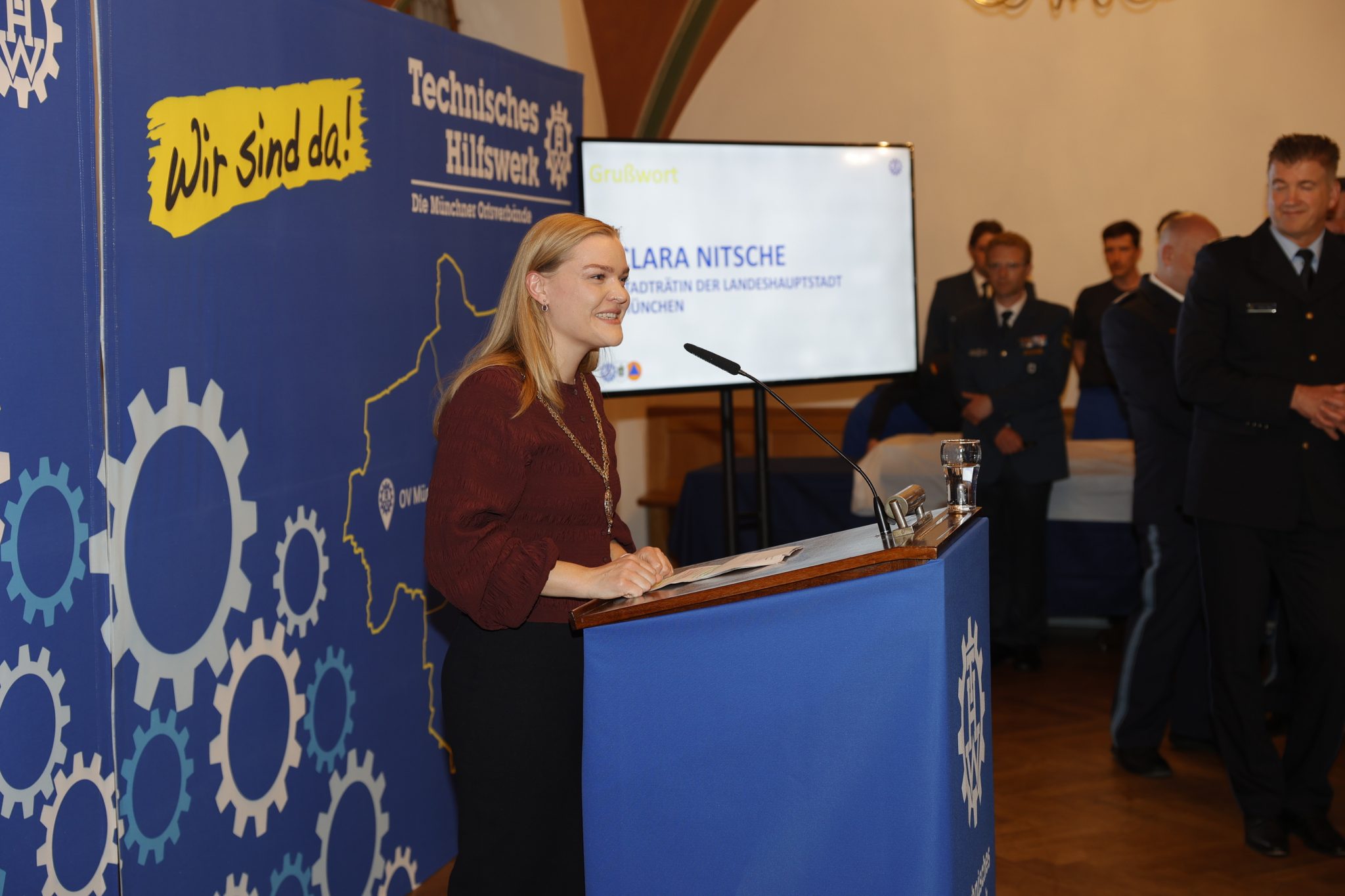 - Clara Nitsche, Stadträtin der Landeshauptstadt München, überbrachte die Grüße der Stadt, da der Zweite Bürgermeister Dominik Krause kurzfristig verhindert war. Sie hob die Verlässlichkeit des THW als festen Bestandteil der Münchner Sicherheitsarchitektur hervor.